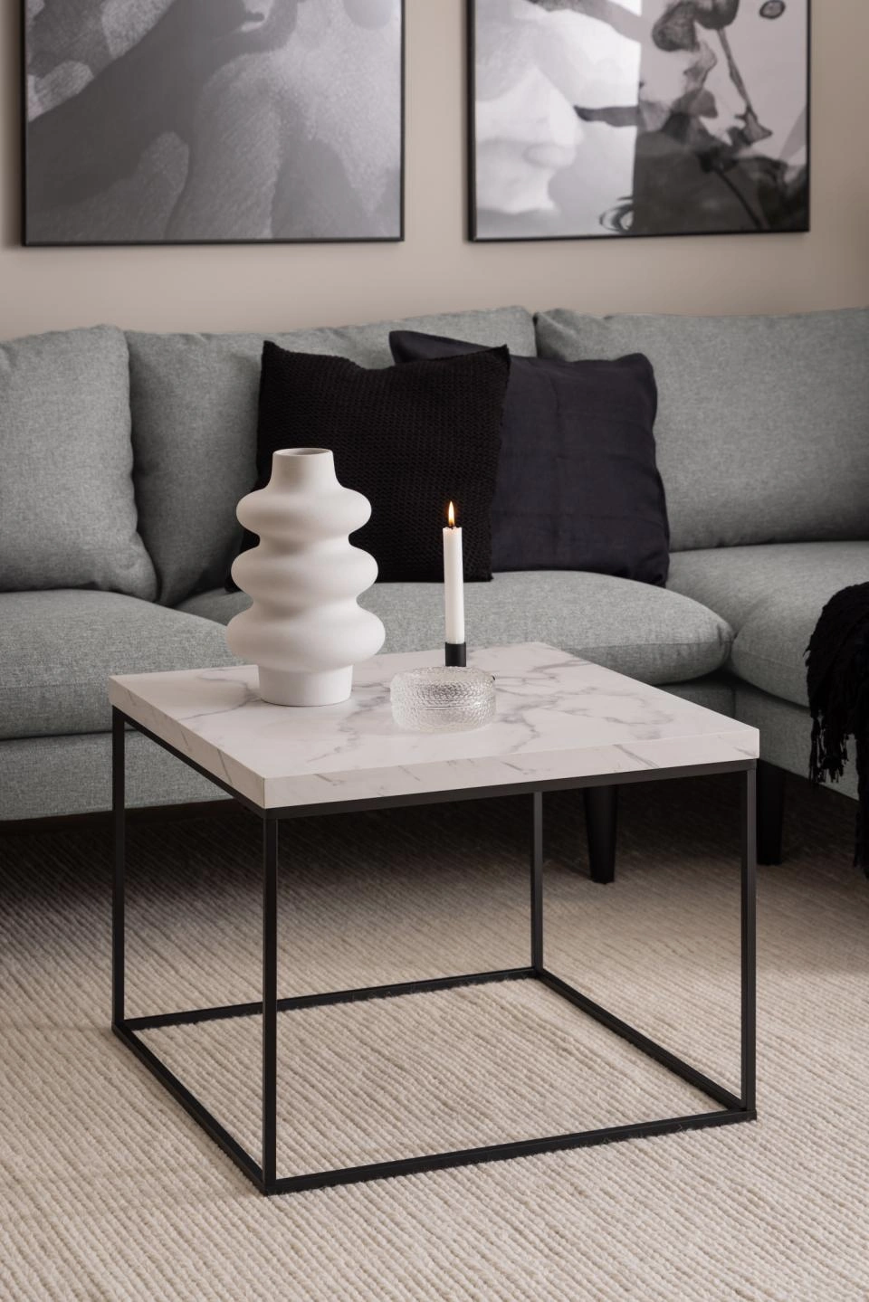 Pirmas dalykas, kurį greičiausiai pastebėsite šiame kavos staliuke, – išraiškingas stalviršis, kylantis iš kvadratinio plieninio pagrindo. Jis yra storas ir dekoruotas balto marmuro imitacija, suteikiančia staliukui ryškų, drąsų charakterį. Tad jei ieškote akcentinio baldo, kuris aiškiai išsiskirtų erdvėje, tai – puikus pasirinkimas.