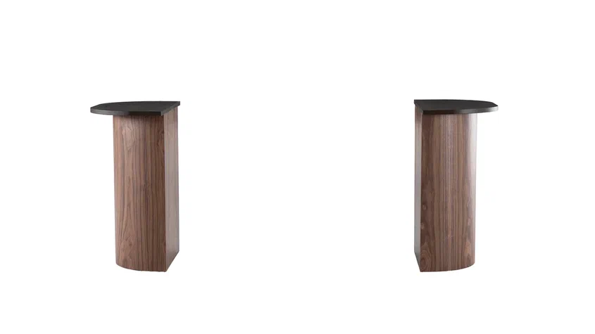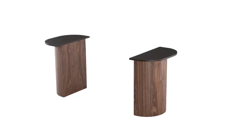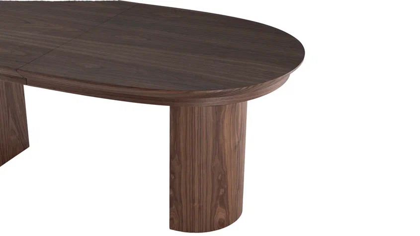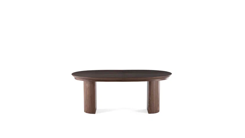 Stalo dizainas išlaikytas harmoningas ir subalansuotas – švelniai suapvalinti kampai suteikia stalui vizualinio švelnumo. Dvi stambios medinės kojos užtikrina konstrukcijos stabilumą ir solidų vizualinį akcentą, puikiai derantį tiek moderniame, tiek klasikiniame interjere.