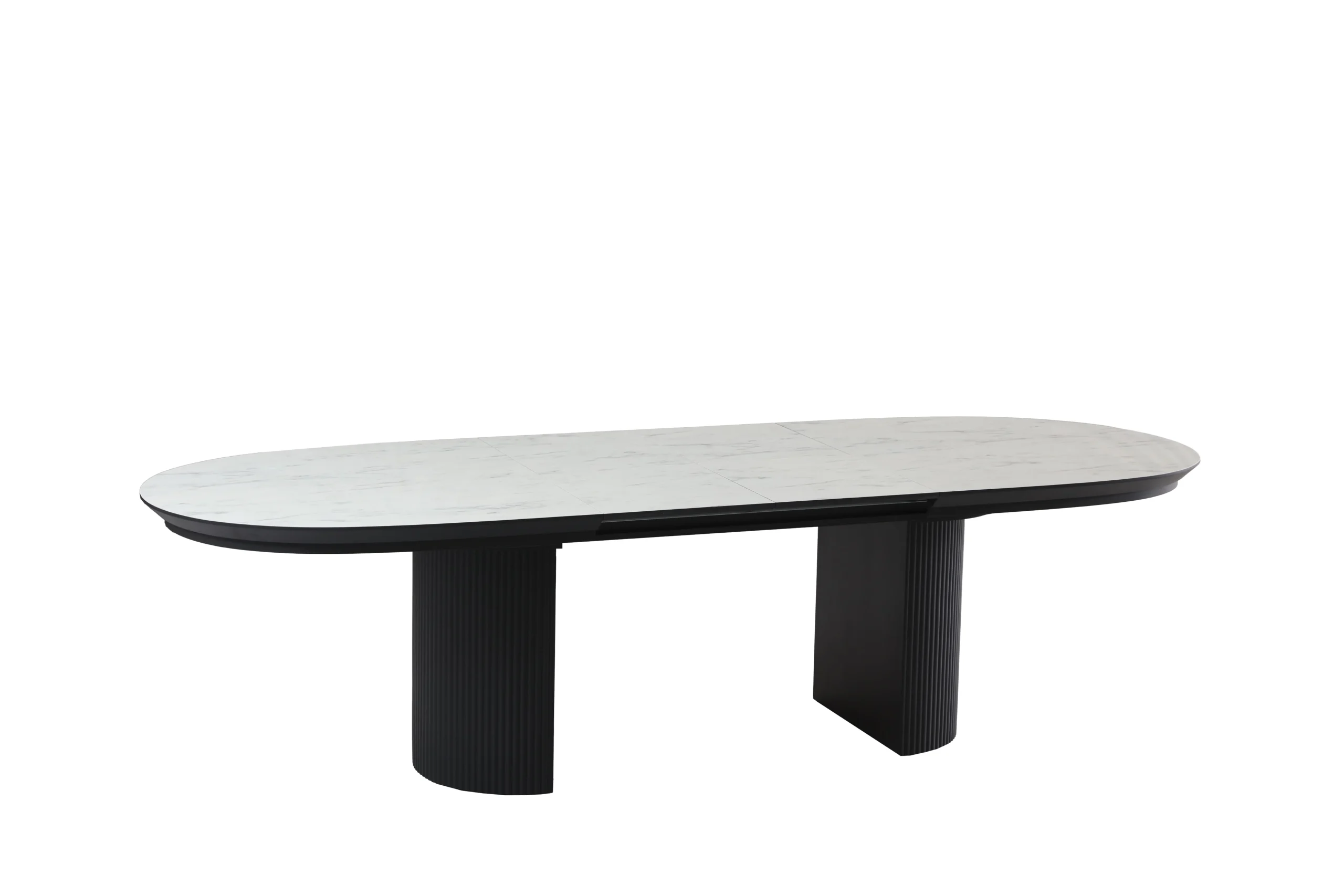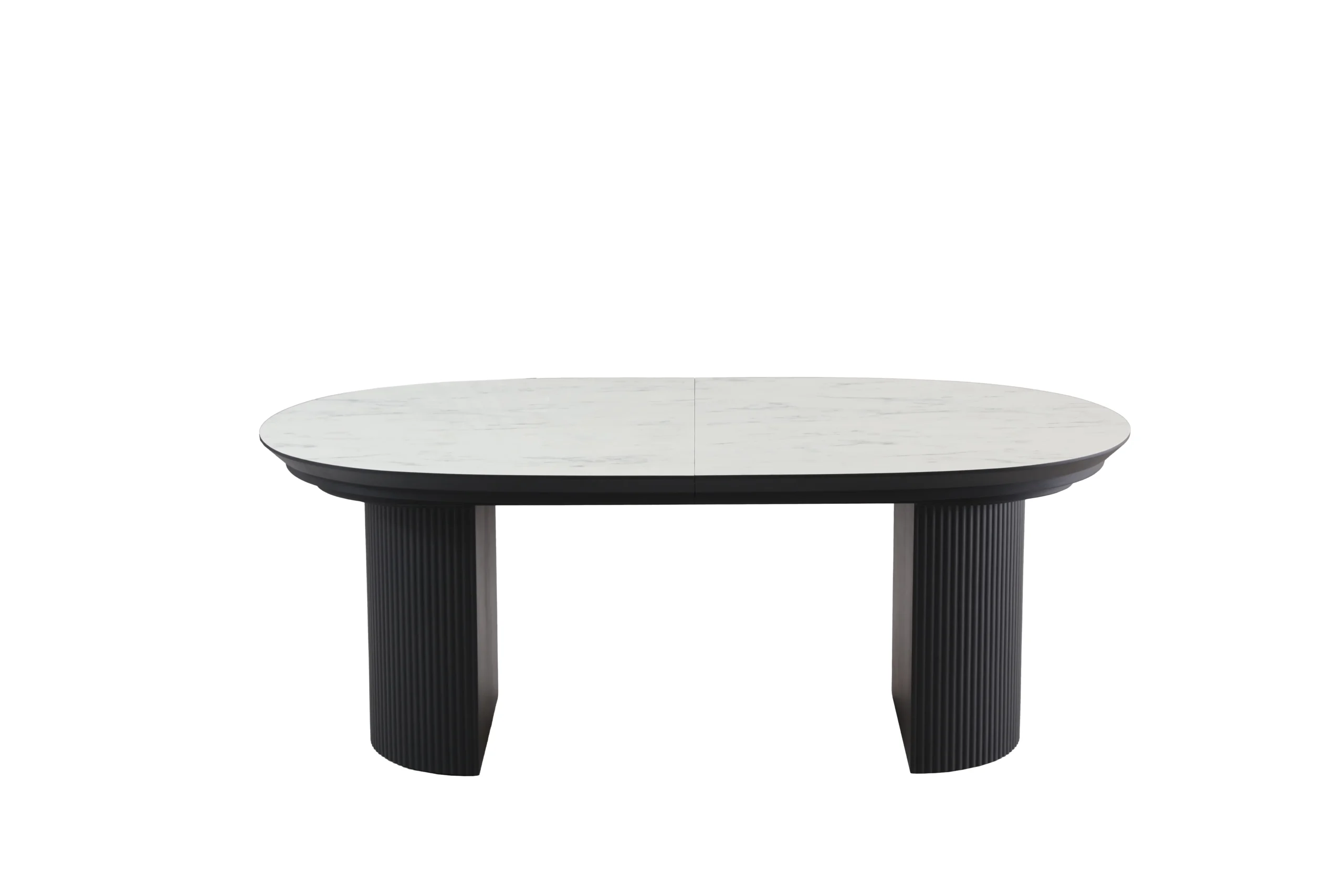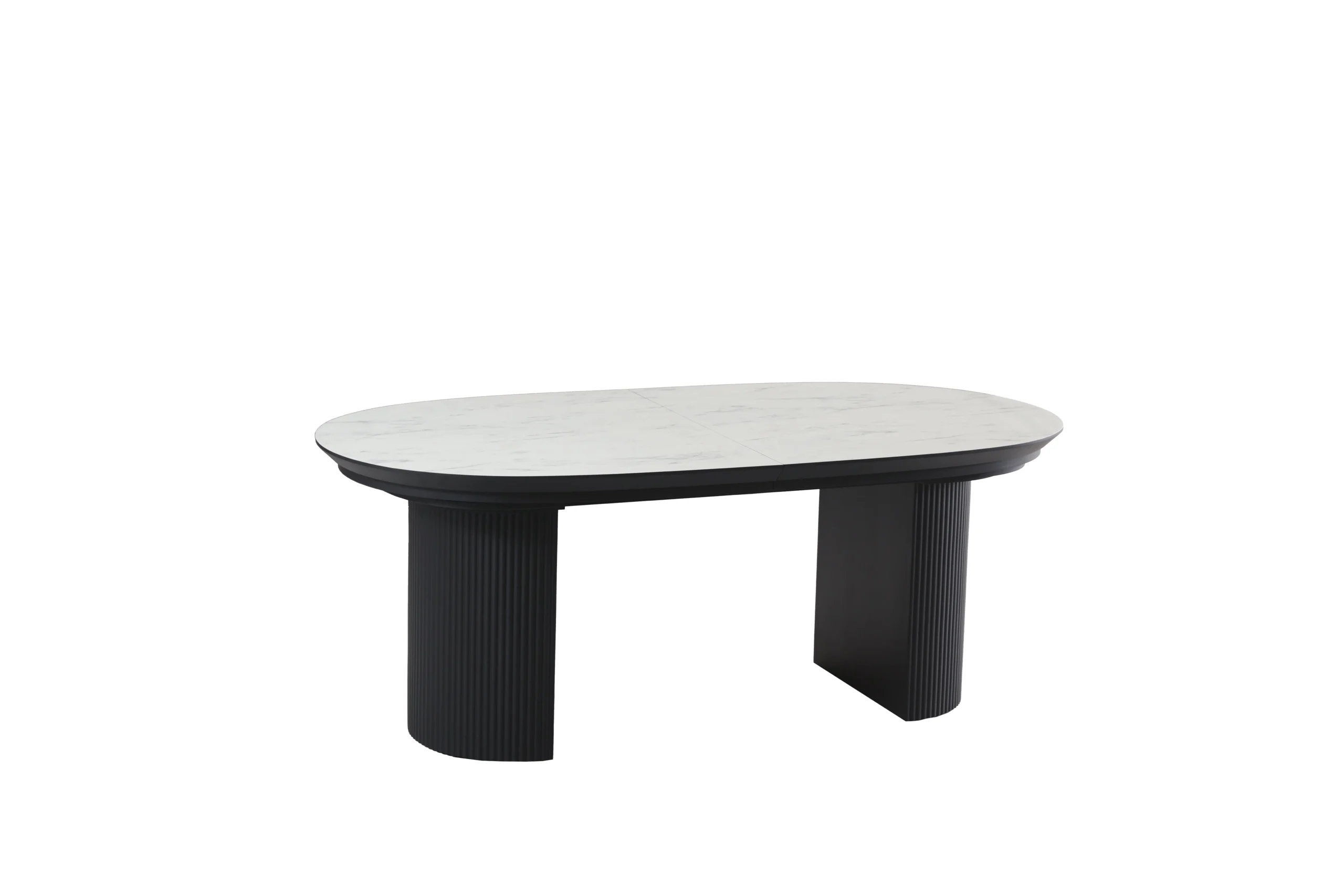 Stalo dizainas išlaikytas harmoningas ir subalansuotas – švelniai suapvalinti kampai suteikia stalui vizualinio švelnumo. Dvi stambios medinės kojos užtikrina konstrukcijos stabilumą ir solidų vizualinį akcentą, puikiai derantį tiek moderniame, tiek klasikiniame interjere.