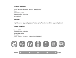 | Čiužinio savybės | Kokoso pluoštas, Medvilnė, Pralaidus orui, Putų poliuretanas, Vakuumo pakuotėje |