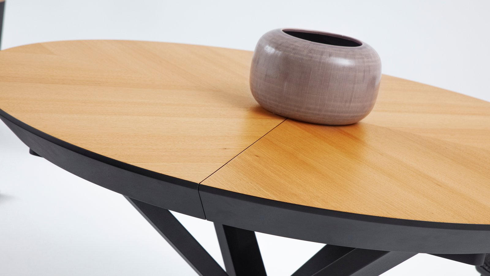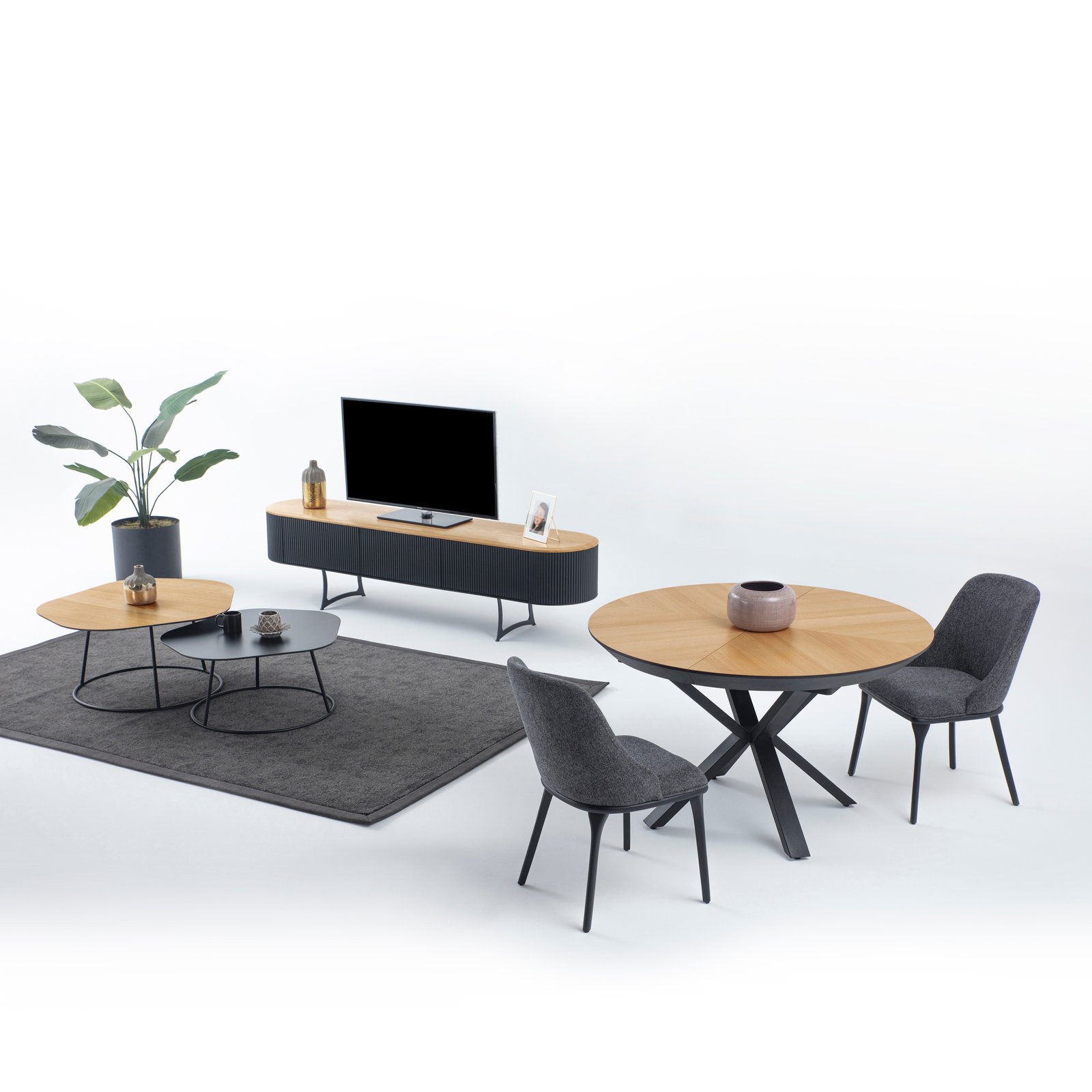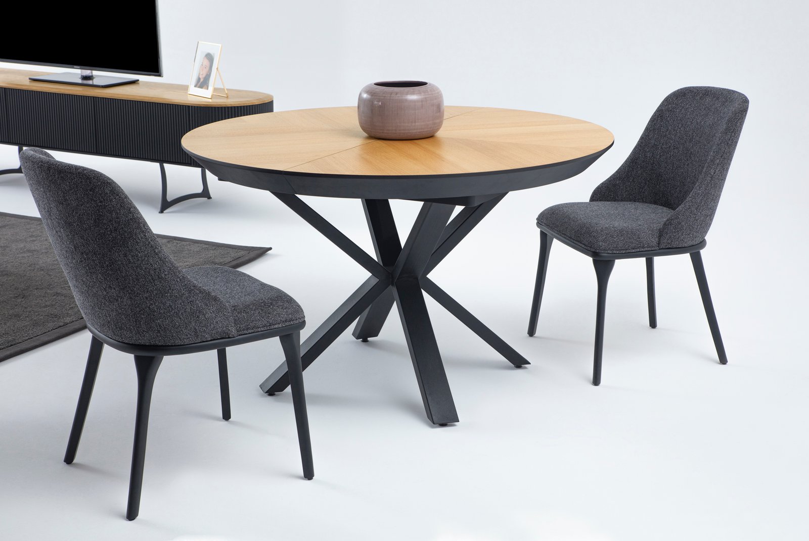 Stalas DUBLIN – puikus pasirinkimas tiek elegantiškiems, tiek praktiškiems interjerams. Šis išskleidžiamas apvalus stalas su HDF įvairių spalvų stalviršiu pasižymi ilgaamžiškumu ir stilingumu, kurdamas prabangos pojūtį jūsų erdvėje.