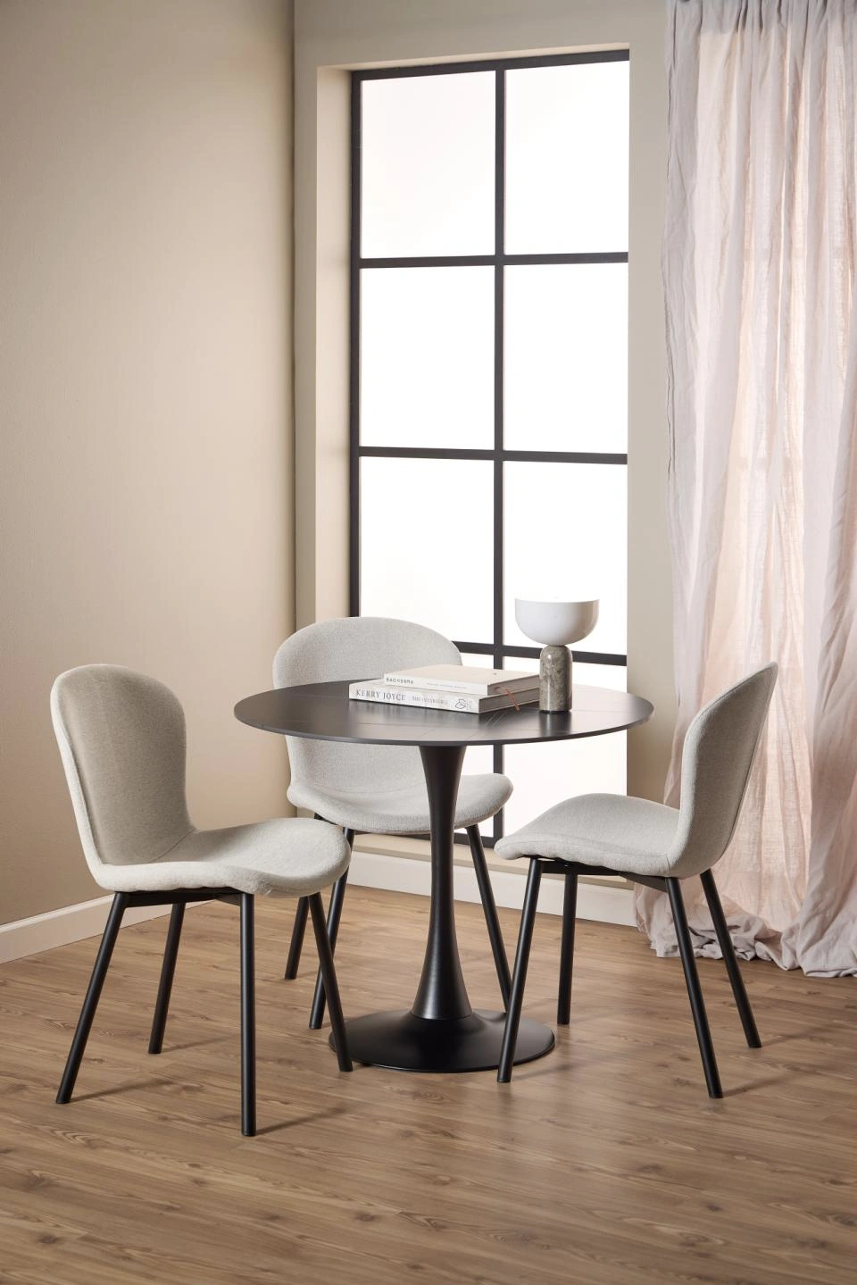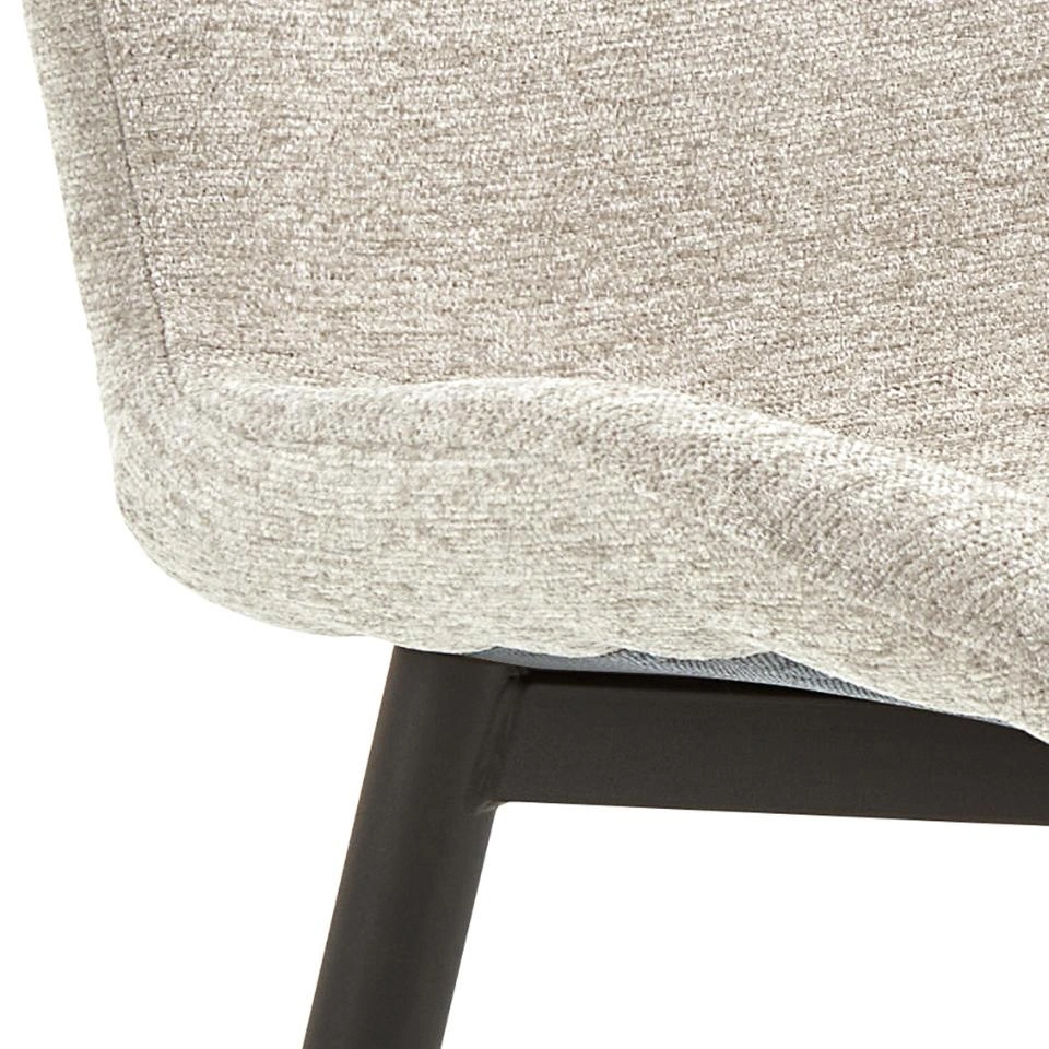 Šios valgomojo kėdės grakščios, banguojančios linijos ir kontrastingos juodos kojelės suteikia valgomojo erdvei gyvumo. Apmušta minkštu, smėlio spalvos, šenilę primenančiu audiniu, ji lengvai derinama su įvairiomis spalvomis ir medžiagomis. Šiuolaikiško charakterio ir subtilios elegancijos derinys sukuria išskirtinį patrauklumą. Tokia kėdė taps akcentu tiek kasdieniams šeimos pietums, tiek ypatingoms progoms.