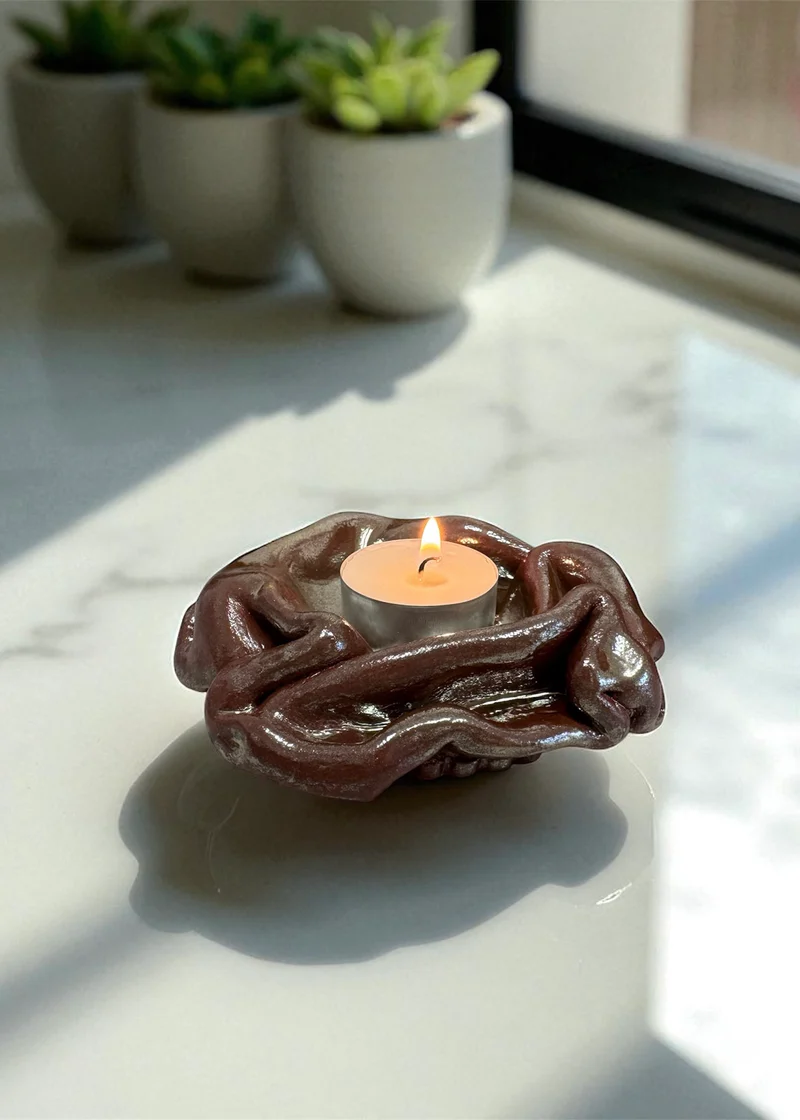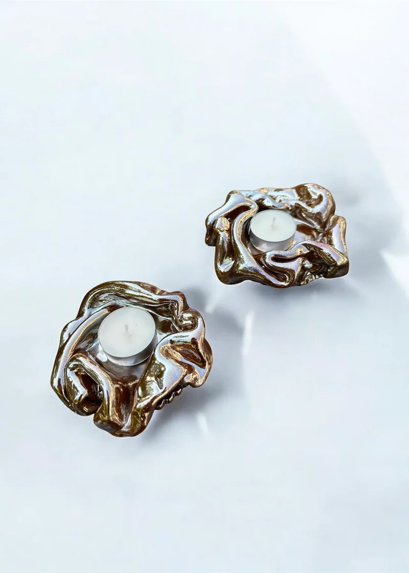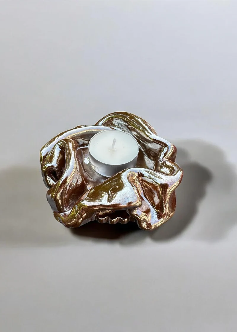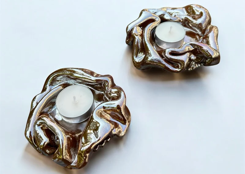 Įneškite šilumos ir meno į savo namus su unikalia rankų darbo keramikine žvakide. Ši elegantiška, blizgi keramikinė žvakidė išsiskiria organiškomis, tarsi vėjyje plazdančio audinio formomis. Kiekvienas gaminys – individualus ir nepakartojamas kūrinys, kuris suteiks interjerui rafinuoto žavesio.