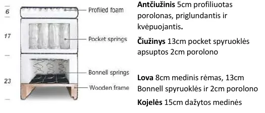 Lova 8cm medinis rėmas, 13 cm Bonnell spyruoklės ir 2 cm porolono