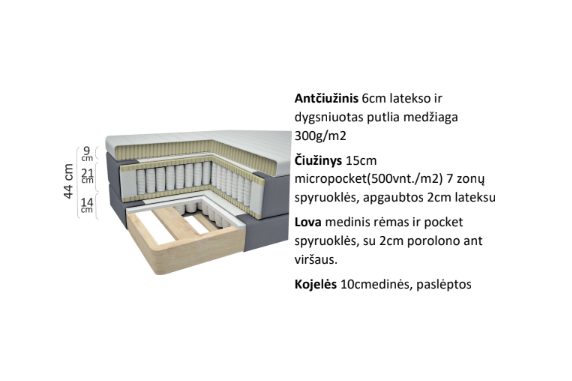 Lova medinis rėmas ir pocket spyruoklės, su 2 cm porolono ant viršaus.