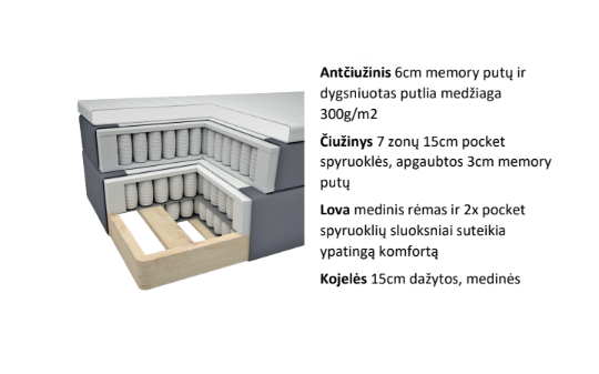 Trys spyruoklių sluoksniai su 7 zonomis ir memory putomis prisitaikys prie kiekvieno kūno. Memory putos gelbėja su nugaros skausmu, apgaubdamos ir suteikdamos patogų palaikymo jausmą.