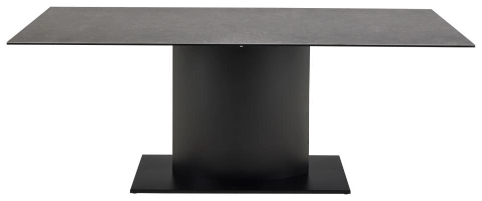 Šis valgomojo stalas pabrėžia geometrijos ir tiesių linijų grožį. Plonas stačiakampis stalviršis, pagamintas iš juodos keramikos, atsiremia į juodą panelinį pagrindą – praktiškas sprendimas kasdieniam naudojimui, nes paviršius išlieka atsparus įbrėžimams. Toks ryškus ir modernus dizainas suteiks naujos energijos bet kuriai valgomojo erdvei.