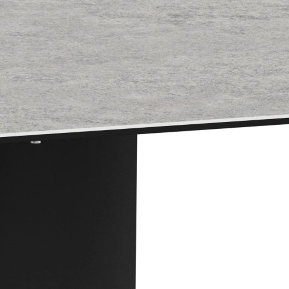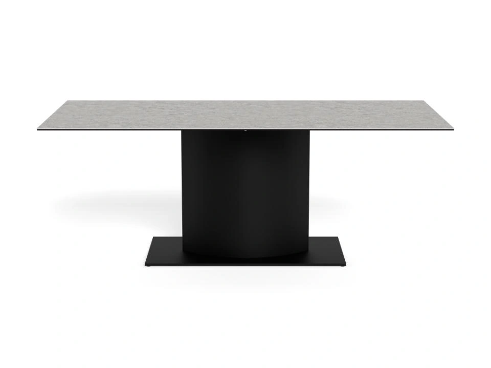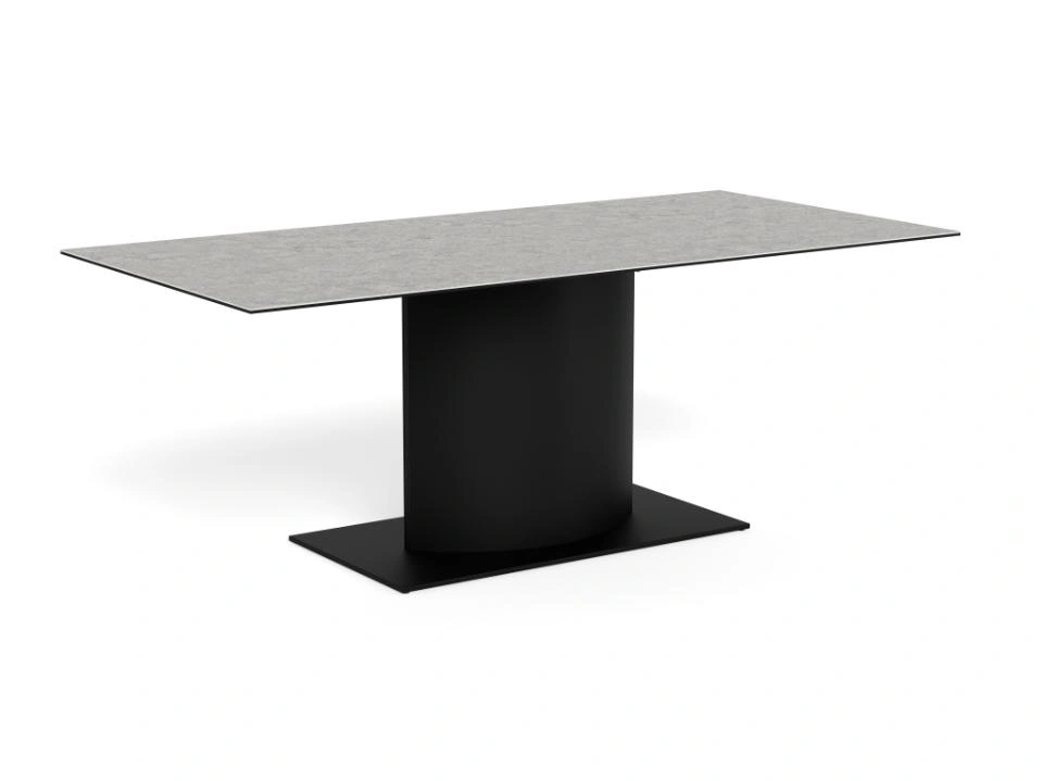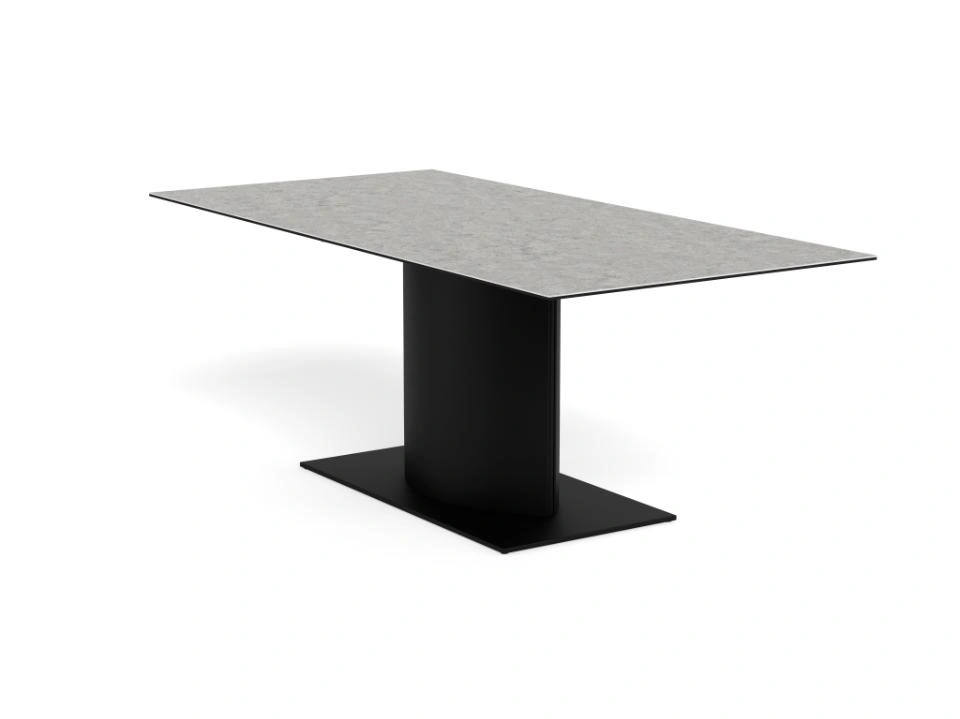 Šis valgomojo stalas pabrėžia geometrijos ir tiesių linijų grožį. Plonas stačiakampis stalviršis, pagamintas iš pilkos keramikos, atsiremia į juodą panelinį pagrindą – praktiškas sprendimas kasdieniam naudojimui, nes paviršius išlieka atsparus įbrėžimams. Toks ryškus ir modernus dizainas suteiks naujos energijos bet kuriai valgomojo erdvei.