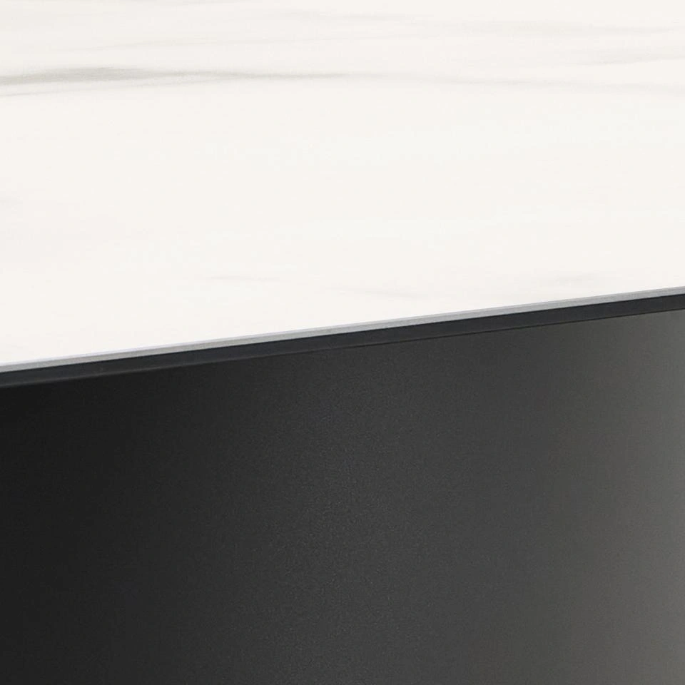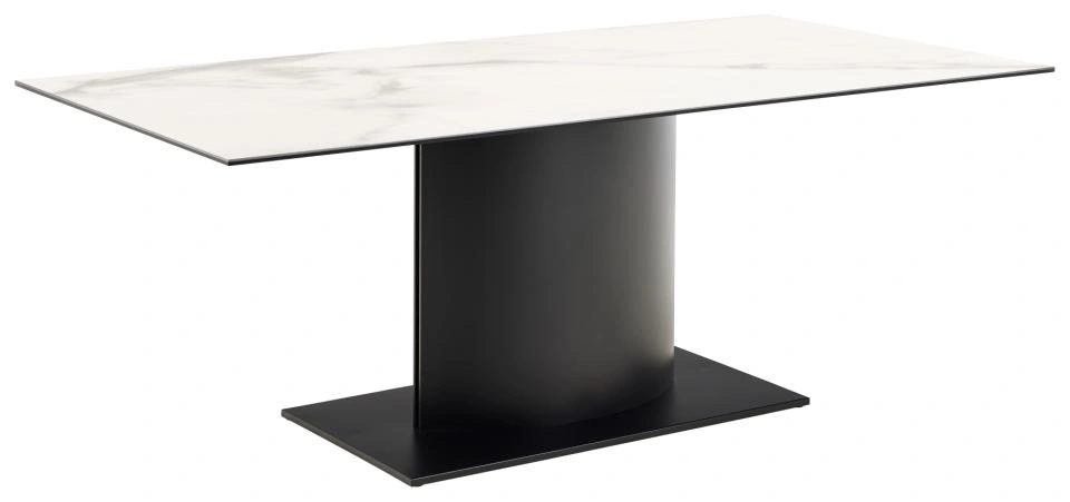 Šis valgomojo stalas pabrėžia geometrijos ir tiesių linijų grožį. Plonas stačiakampis stalviršis, pagamintas iš baltos šiurkščios keramikos, atsiremia į juodą panelinį pagrindą – praktiškas sprendimas kasdieniam naudojimui, nes paviršius išlieka atsparus įbrėžimams. Toks išskirtinis dizainas įkvėps naują energiją bet kurio valgomojo erdvei.