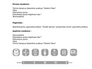 | Čiužinio tipas | Spyruoklinis (Pocket) |