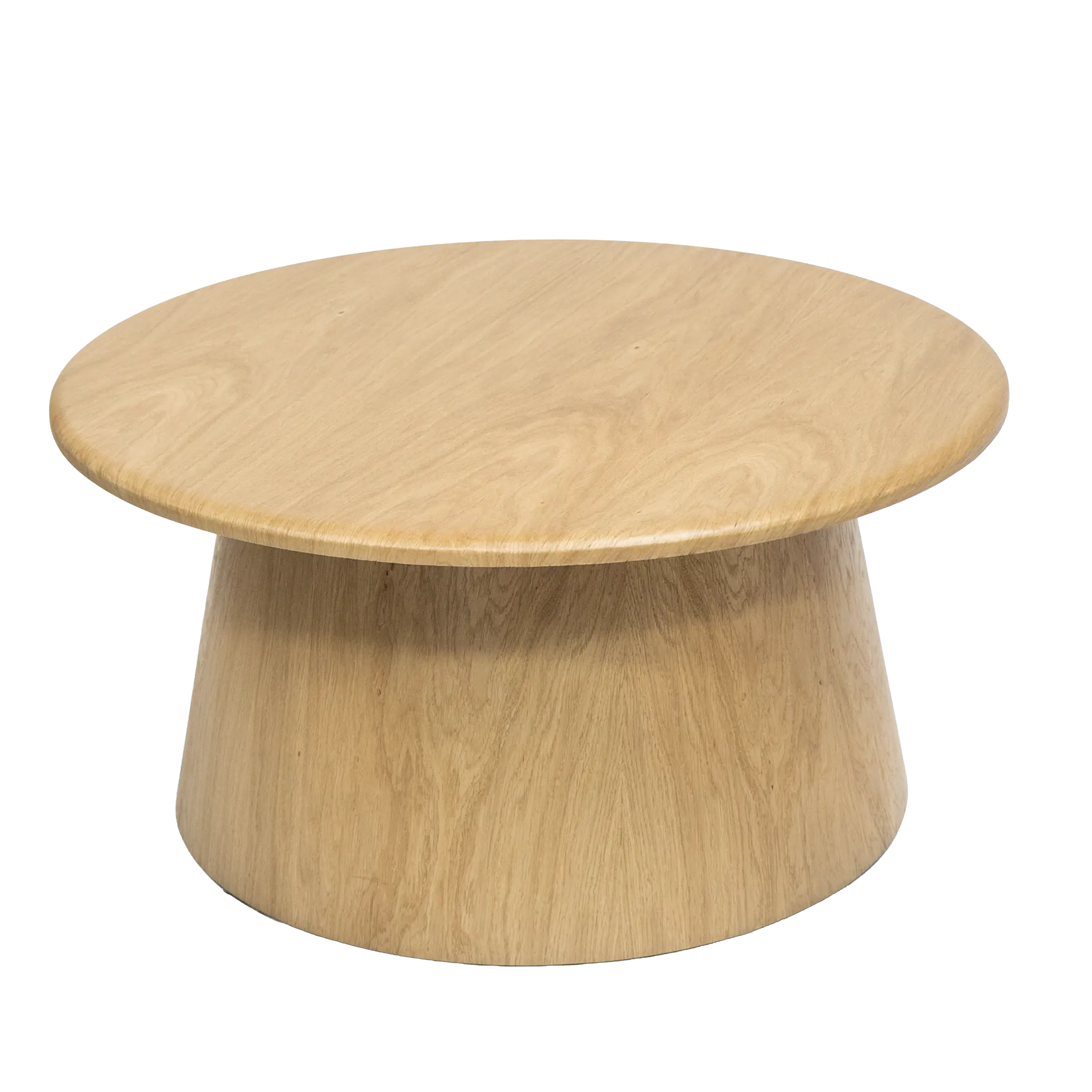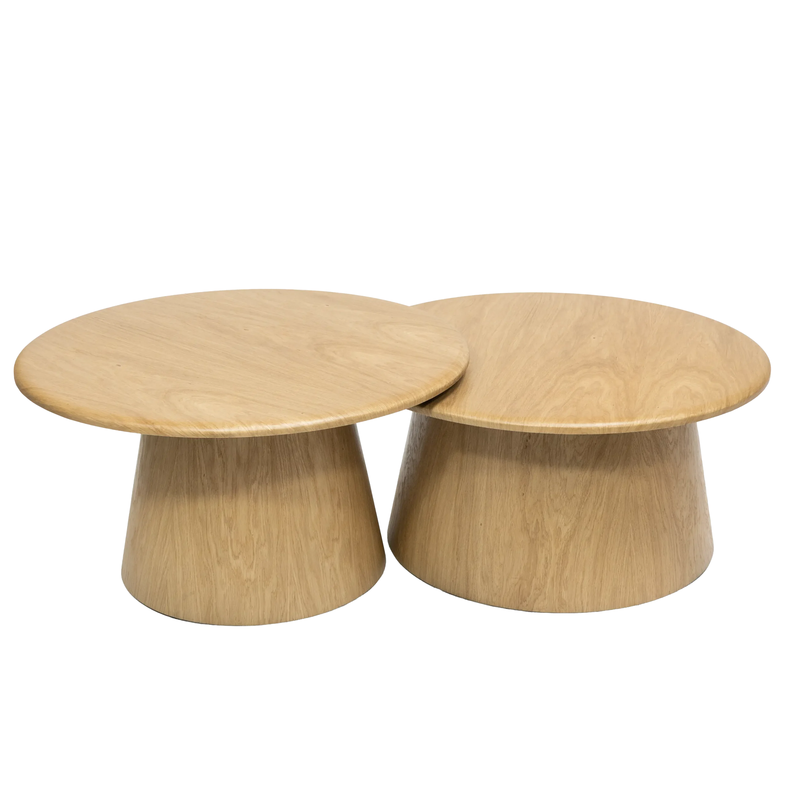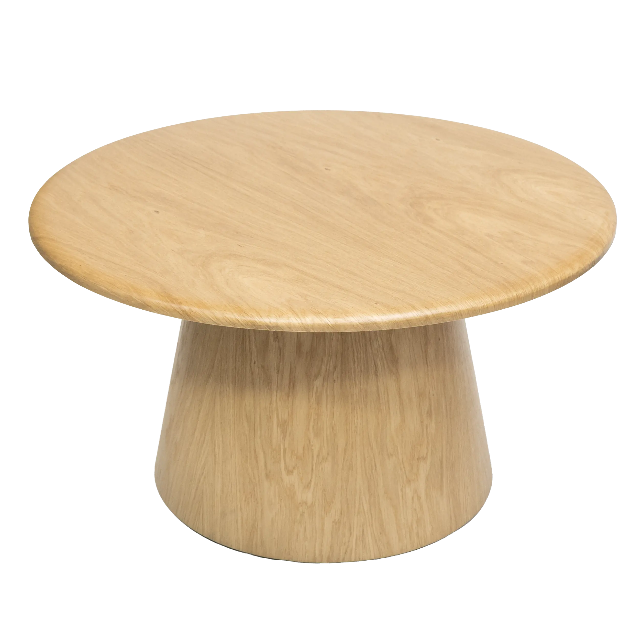 Staliukų paviršiai dengti Oak Veneer spalva, kuri suteikia šilumos pojūtį ir natūralios medienos išvaizdą. Solidi, apvali stalo koja subtiliai pereina iš platėjančio pagrindo į siauresnę viršūnę, kurdama skulptūrišką ir išskirtinį dizainą, traukiantį akį.