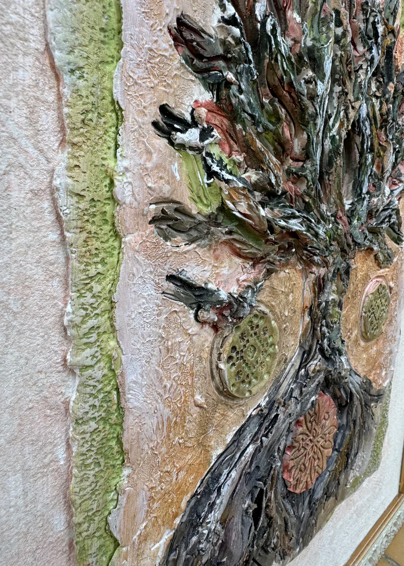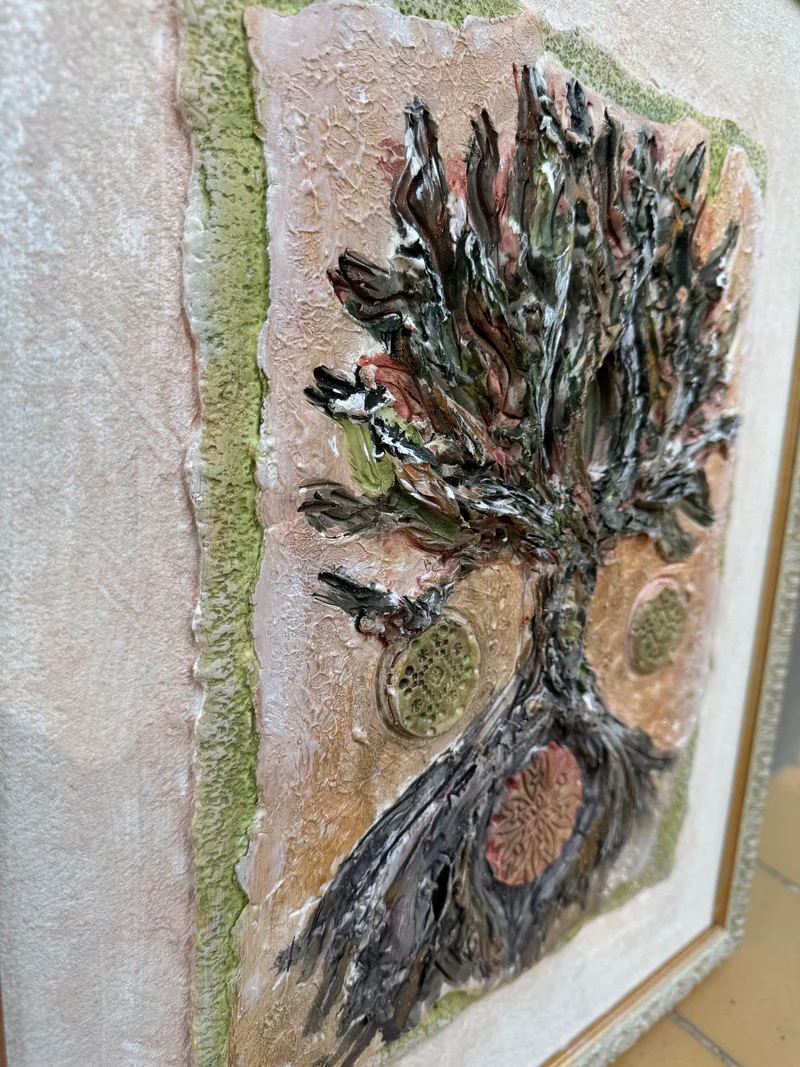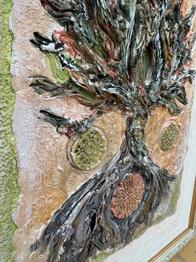 Įspūdingas rankų darbo keramikinis paveikslas „Gyvybės šokis“ – tai unikalus meno kūrinys, kuriame susilieja žmogaus figūra ir gamtos simbolika. Kūrinys vaizduoja moters formos medžio kamieną, iš kurio šakų skleidžiasi rudeniniai lapai – tai gyvybės, atgimimo ir metų ciklo metafora. Reljefinis paviršius, sodrios spalvos ir kruopščiai suformuotos detalės suteikia paveikslui išskirtinį gylį ir tekstūrą.
