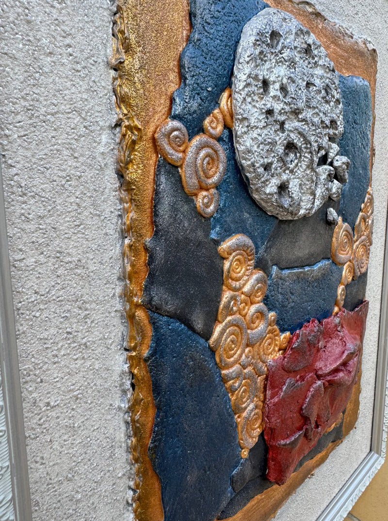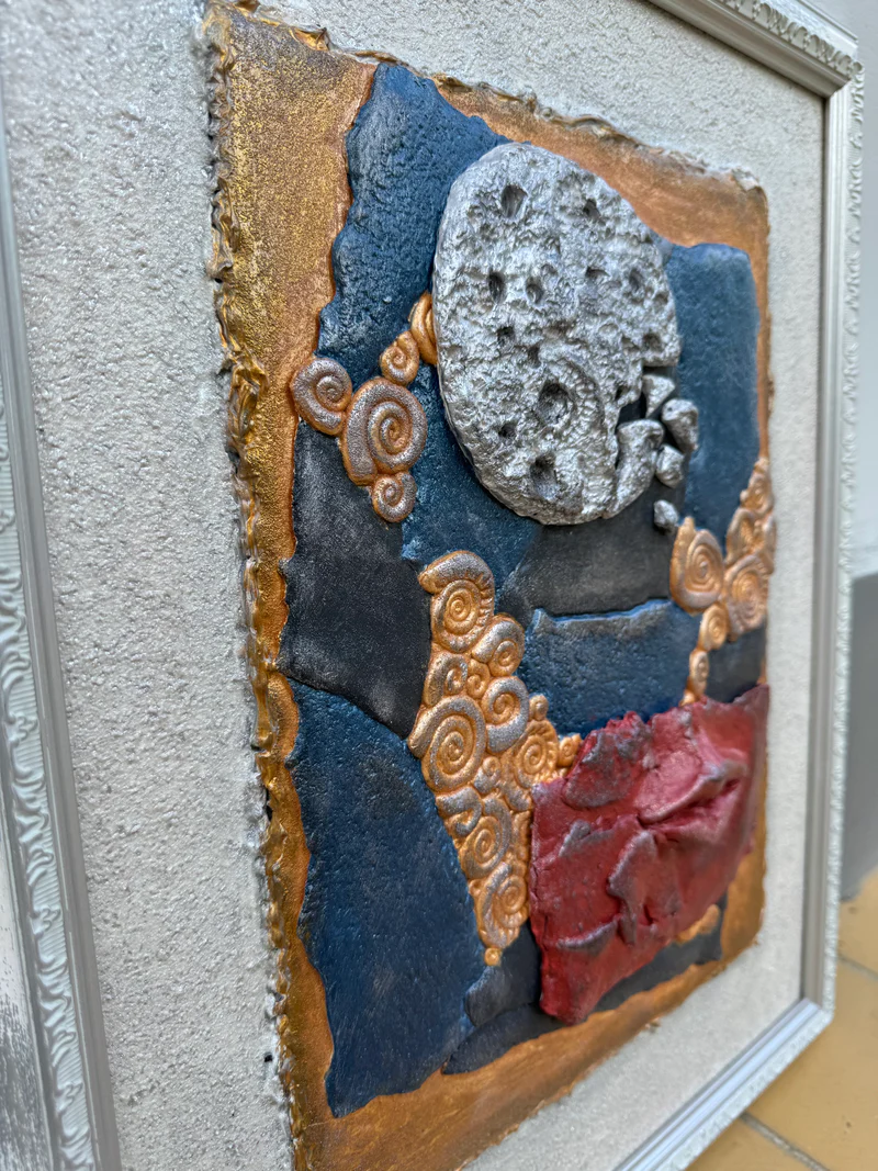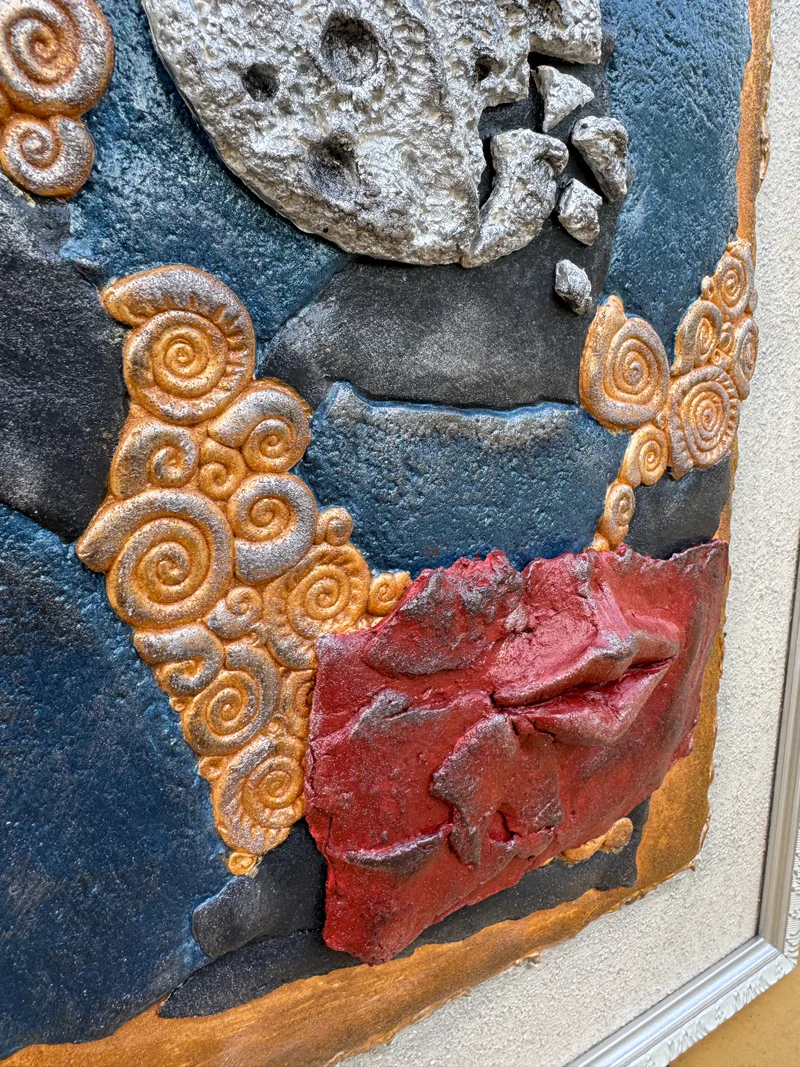Įsigykite išskirtinį meno kūrinį, kuris papuoš bet kurią erdvę savo simbolizmu ir unikaliu tekstūrų deriniu. Rankų darbo keramikinis paveikslas sujungia skirtingas formas, spalvas ir reljefus: suskilęs mėnulis, raudonos lūpos ir spiralės primenančios gamtos stichijas kuria paslaptingą atmosferą, skatinančią apmąstymus ir kūrybingumą.