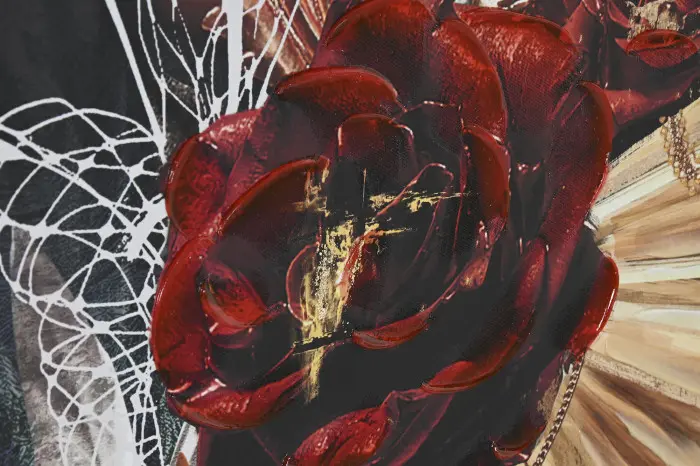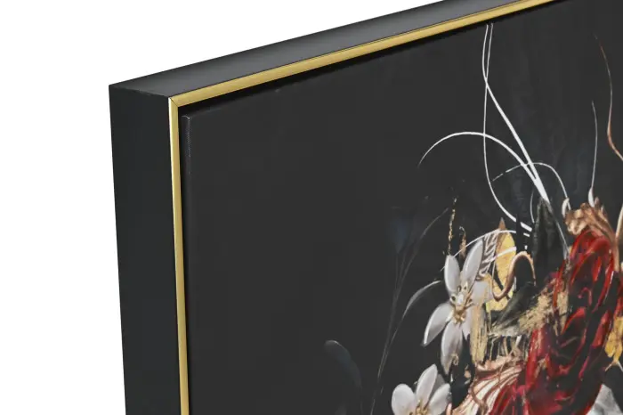 Šis paveikslas vaizduoja elegantiškas figūras su įspūdingomis gėlių kompozicijomis plaukuose ir prabangiais papuošalais. Tamsus fonas subtiliai išryškina šviesias detales, suteikdamas kūriniui gylio ir paslaptingumo. Šis meno darbas taps rafinuotu akcentu, puikiai papildančiu prabangų ar modernų interjerą.
