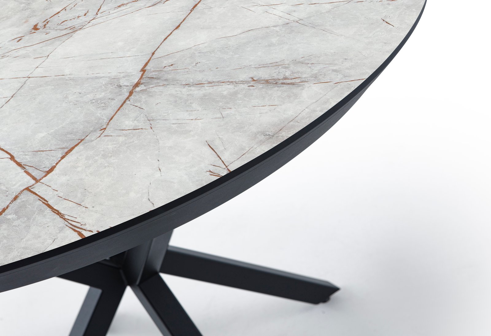 Stalas STAR – puikus pasirinkimas tiek elegantiškiems, tiek praktiškiems interjerams. Šis išskleidžiamas apvalus stalas su marmuro imitacijos blizgiu HDF stalviršiu pasižymi ilgaamžiškumu ir stilingumu, kurdamas prabangos pojūtį jūsų erdvėje.