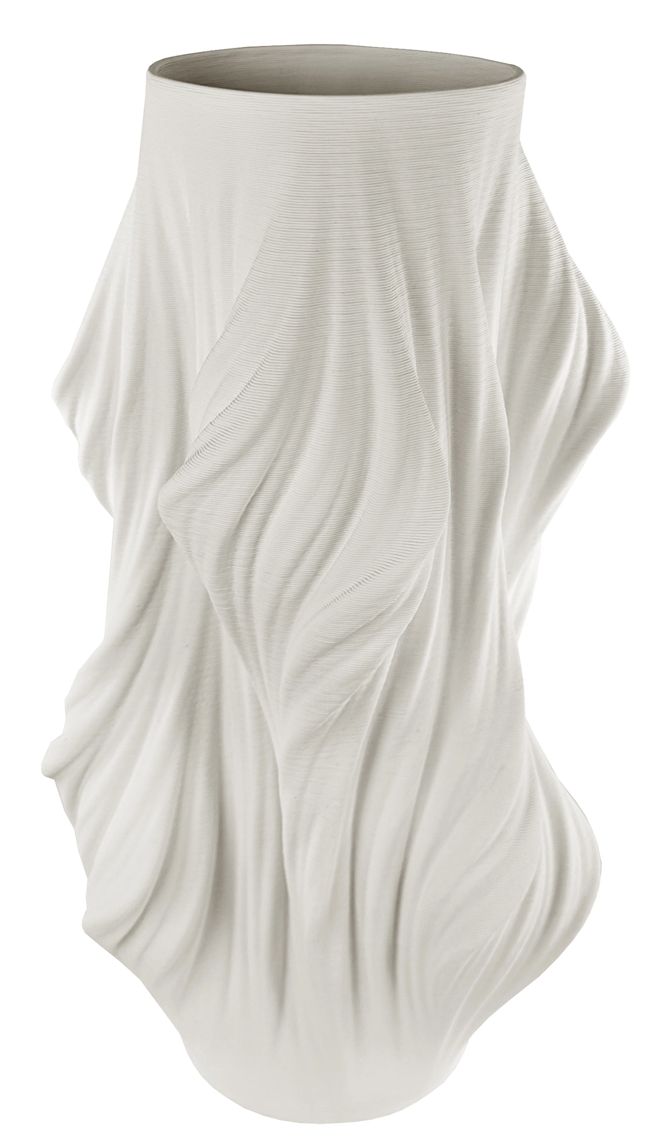 Išskirtinio dizaino vaza, primenanti lengvai krintančio audinio klostes, tampa tikru interjero akcentu. Organinės, banguojančios formos sukuria subtilų judesio įspūdį, o vertikalios tekstūros linijos suteikia paviršiui gylio ir elegancijos.