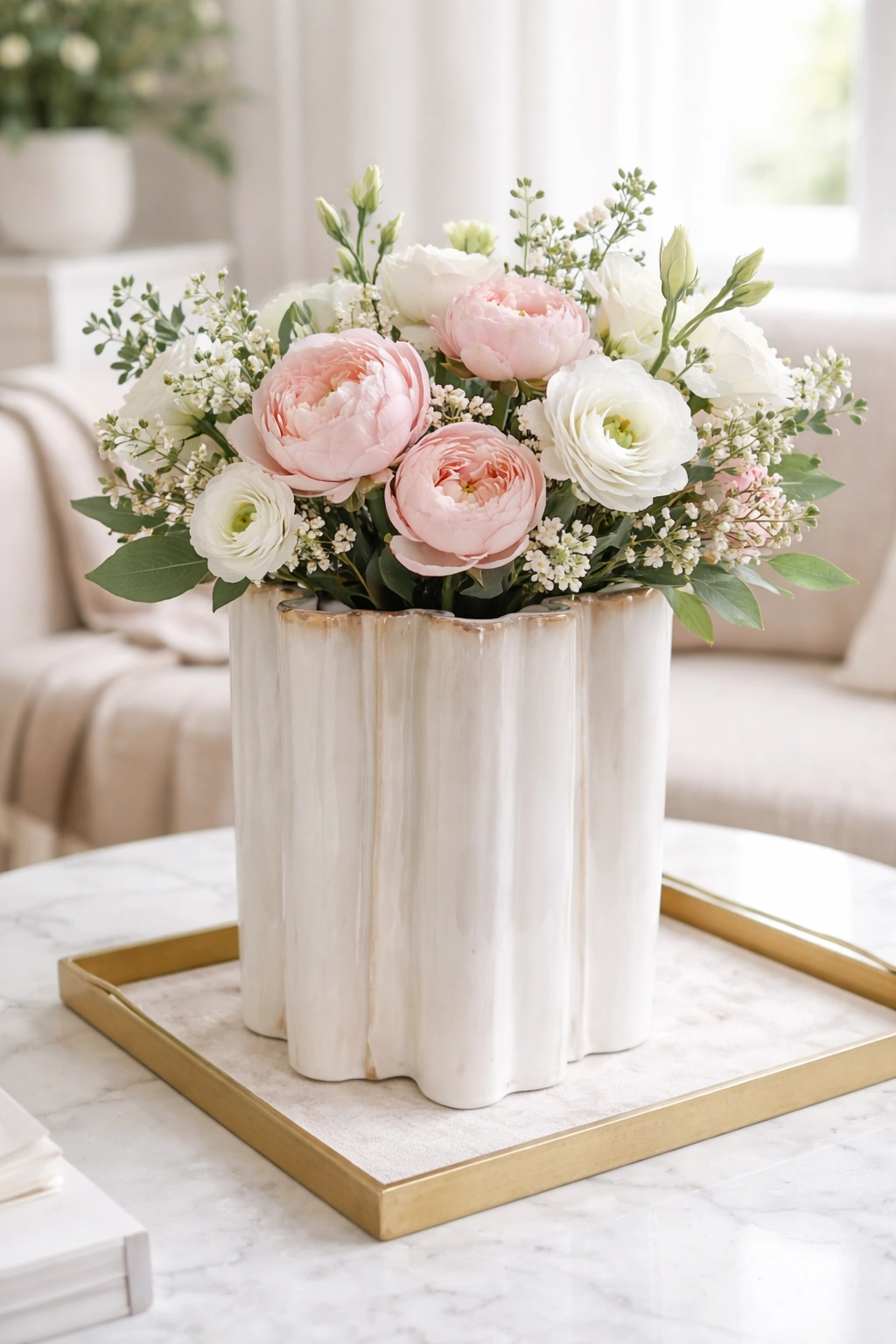 Išskirtinio dizaino vaza, primenanti lengvai krintančio audinio klostes, tampa tikru interjero akcentu. Organinės, banguojančios formos sukuria subtilų judesio įspūdį, o vertikalios tekstūros linijos suteikia paviršiui gylio ir elegancijos.
