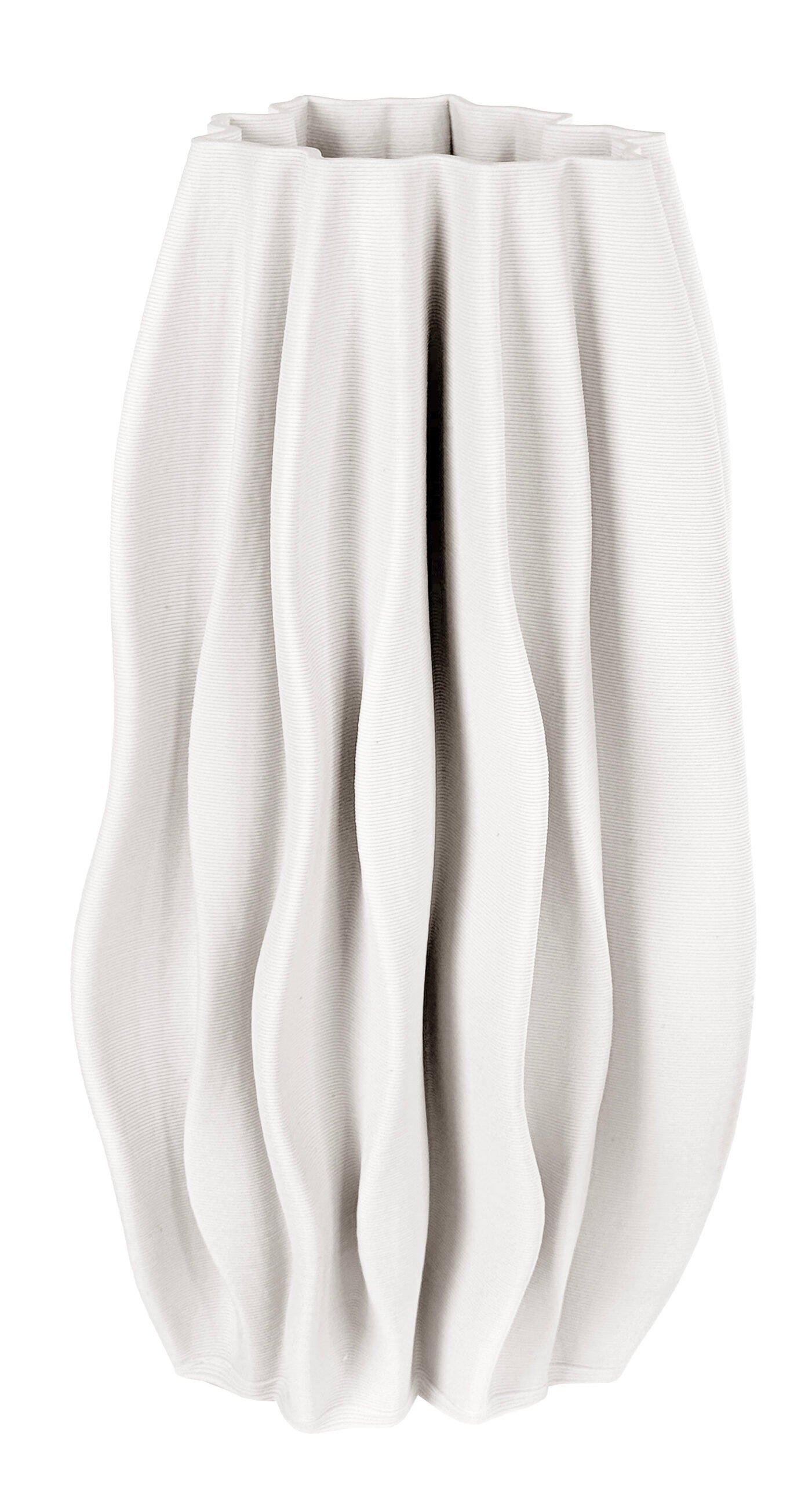 Išskirtinio dizaino vaza, primenanti lengvai krintančio audinio klostes, tampa tikru interjero akcentu. Organinės, banguojančios formos sukuria subtilų judesio įspūdį, o vertikalios tekstūros linijos suteikia paviršiui gylio ir elegancijos.